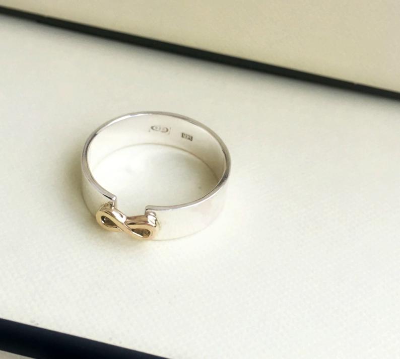 Unisex wedding promise engagement ring made of Sterling silver and solid 14 karat yellow gold. A unique design of band ring made of 925 silver (6 mm width) open in the front and an infinity made of 14 karat solid yellow gold in the middle, connecting between two sides as a symbol for endless love. Perfect love gift for your lover and a special wedding, engagement, anniversary or promise ring.